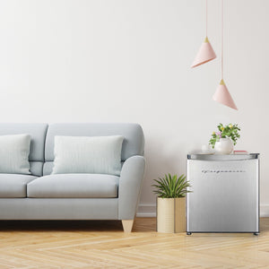 The EFR182 Mini Refrigerator has enough room for your groceries and is compact enough to fit almost anywhere. It features an ice cube chamber freezer with a small freezing compartment, an ice cube tray and an integrated tall bottle holder. The slide-out shelf helps keep your items organized, and has a reversible door design. A sleek, stylish stainless steel finish, invisible door handle and clean lines blend nicely with any decor, and the efficient compressor cooling system ensures low energy consumption.