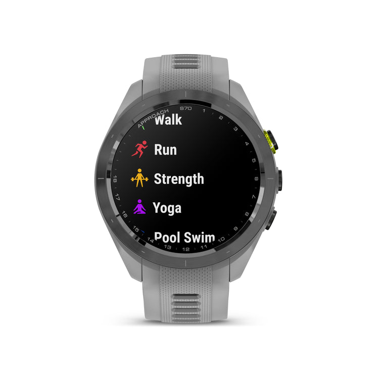If golf is your world, Approach® S70 is your watch. Featuring a stunning 1.2” AMOLED display, this smaller-sized premium smartwatch brings more than 43,000 courses to life and features all the on-course tools you need to lower your handicap. The improved virtual caddie feature provides a recommended club based on your shot dispersion data, elevation, etc. An enhanced PlaysLike Distance feature utilizes a built-in barometer, so you’ll know how far each shot is playing. And on your way to the hole, preloaded green contour data gives you insights into slope direction of the green (with an active Garmin Golf™ app membership). The slim, stylish design looks great on and off the course, with features that support your training and lifestyle including strength, yoga and running. Also get heart rate and advanced sleep monitoring for an extra edge when you’re on the course. With up to 10 days of battery life in smartwatch mode and 15 hours in GPS mode, you’ll always have time for another round.