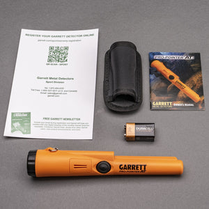 Find your treasure targets faster! Garrett’s Pro-Pointer AT is the best selling pinpointer in the industry. Fully submersible to 20 feet (6m), the Pro-Pointer utilizes a patented proportional audio and vibration pulse that increases as the pinpointer is moved closer to metallic targets. With 360-degree side scan detection plus a pinpointing tip, the Pro-Pointer AT’s patented scraping blade can be used to quickly sift through soil to find your target. Simple, one-button operation: simply tap the button to power on or off, to retune to a target, or to scroll through six adjustments for sensitivity and stealth mode (vibration only). The sides of the pinpointer include a molded lanyard attachment loop and a ruler in inches and centimeters to judge target depth. The Pro-Pointer AT includes a woven belt holster and a 9-volt battery.