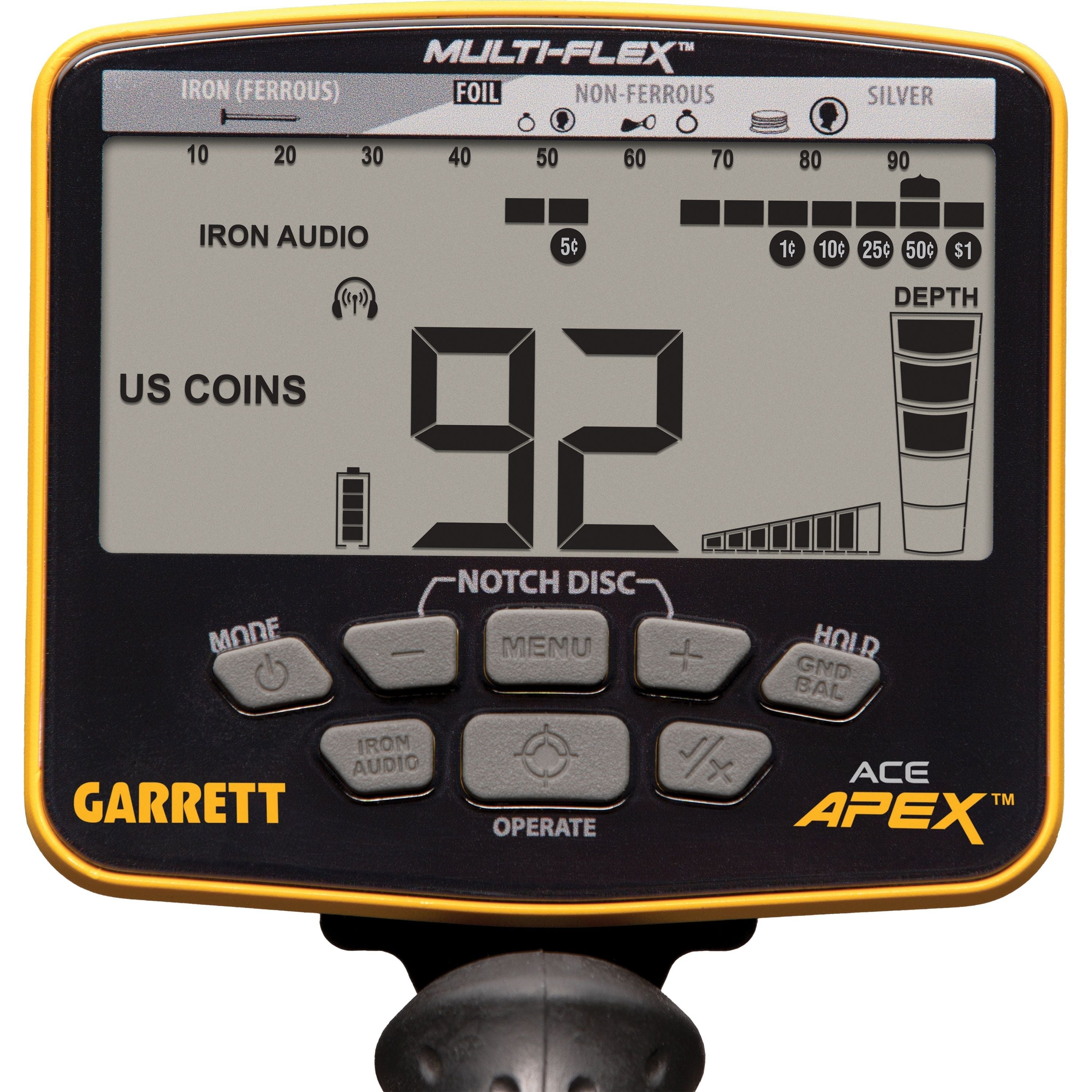 Garrett’s ACE Apex is lightweight, advanced enough for veteran treasure hunters and yet simple enough for beginners to master quickly. Its built-in rechargeable battery provides up to 15 hours of use per charge and Apex software can be easily updated with its included micro-USB connection cable. Apex includes multi-flex multi-frequency technology, giving its users the flexibility to select powerful single detecting frequencies or simultaneous or multi-frequency options. These frequency choices allow users to adapt their detectors to various ground mineralization conditions and to enhance detection of preferred metallic treasures.