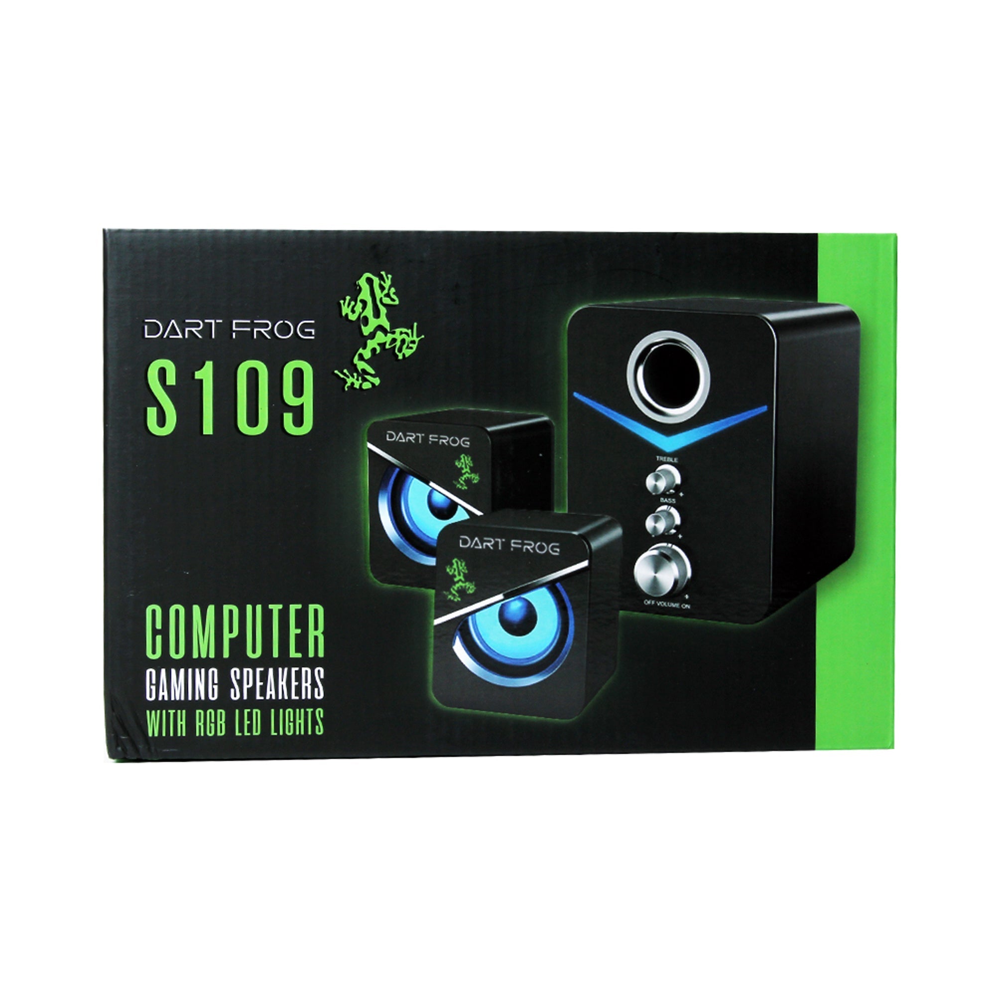 Experience the next levels of sound intensity with the Dart Frog 2.1 Gaming Speakers system. In addition to the realistic sound experience from the speakers and sub woofer the addition of the colorful LED lighting take gaming to a new level!. This Dart Frog Computer gaming speaker system all you need to bring your games to the next level!