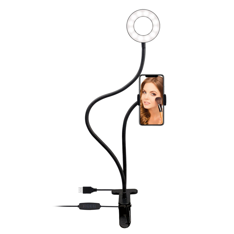 Hands-free all-in-one social medial starter kit is perfect for recording videos, tutorials, and podcasts. Easily clamp it to any desk and adjust the maneuverable arms to the perfect height and angle. Fits most mobile phones and is easily to assemble. The selfie ring lights provides the perfect amount of light. Customize the light brightness from 3 types of light colors (white, natural and warm).