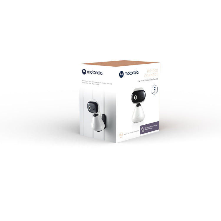 PIP, the smart friendly night vision HD camera that lets you keep an eye on your baby no matter where you are. The Motorola PIP1000 CONNECT links to the Motorola Nursery app via Wi-Fi to enable Full HD (1080p) video through your smartphone. The camera can then be controlled remotely through the Motorola Nursery app, so you can get the best view of your baby, as well as listen in and talk to your little one using the two-way talk feature. PIP can be wall or table mounted, letting you move it when you need to. A built-in sensor tells you what the room temperature is, and pre-loaded lullabies, soothing sounds and stories are there when your baby needs them most.