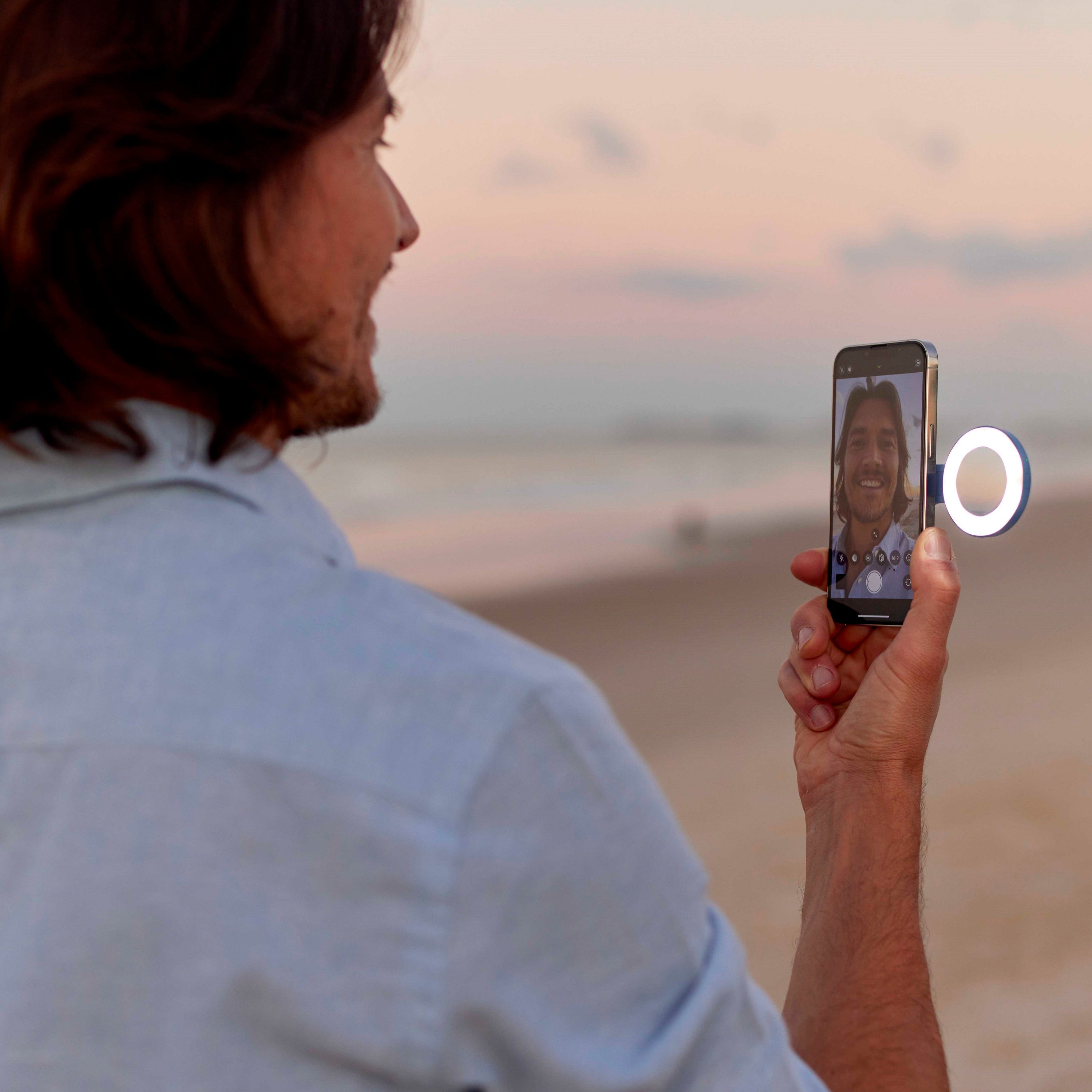 With 4 levels of brightness intensity, a hinged design that swivels up for selfies, and a mirror to make last minute checks before you go live, SnapLight helps take your photos and videos to the next level. SnapLight works with any smartphone using the included magnetic sticker, and is MagSafe compatible.