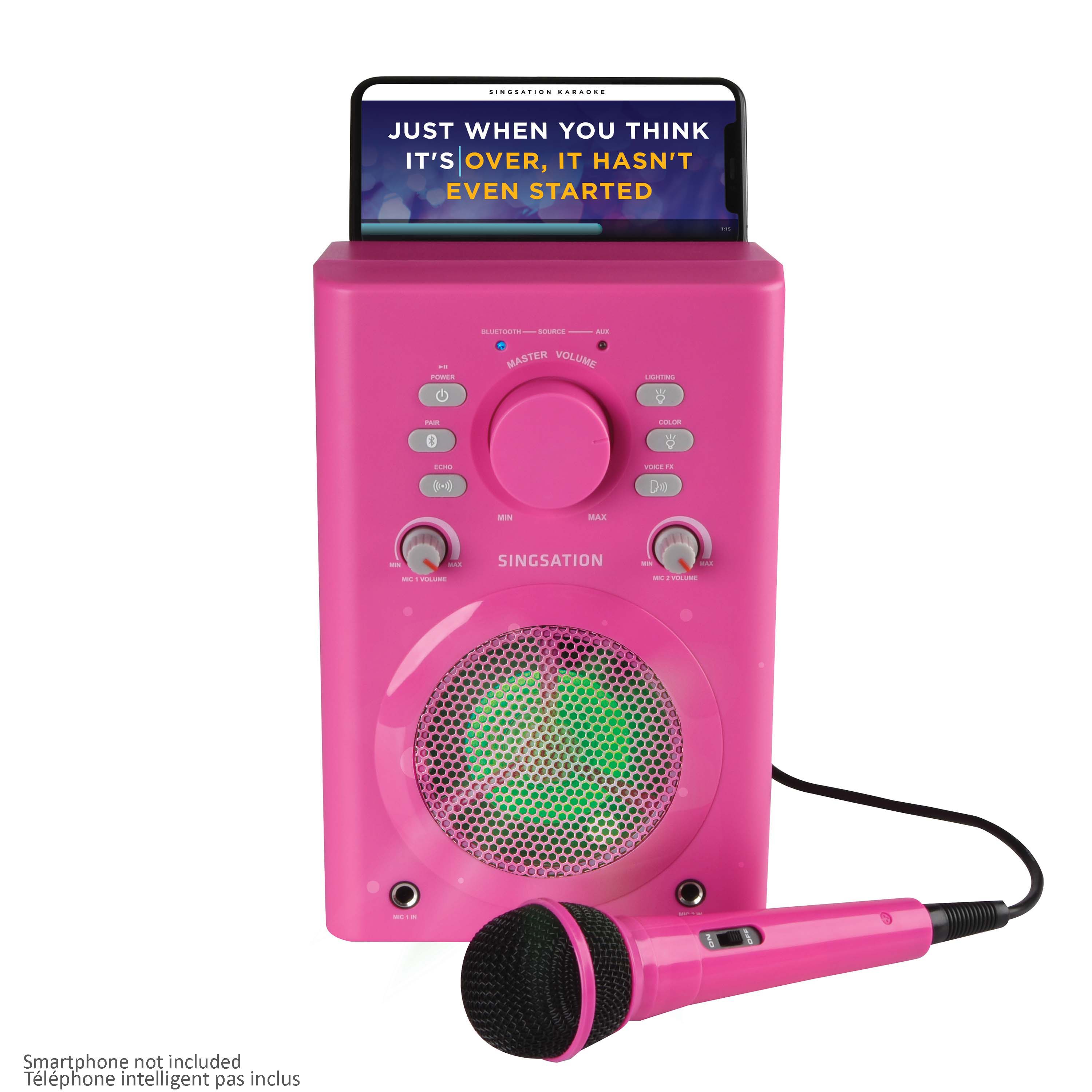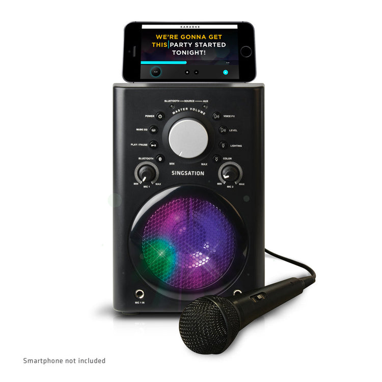 When it comes to adding some glitz and glam to your get-togethers - no matter the size - nothing outperforms the Singsation CLASSIC Karaoke System and Bluetooth Speaker. The Classic generates room-filling sound along with an amazing light show with every performance. Pair it to your phone or tablet and sing along to your favourite music or YouTube(R) videos. It includes a microphone and powerful wireless speaker with 9 multi-colour light modes and 3 voice effects to help you sound like a pro. Its compact design includes a cradle to hold your smartphone or tablet. Two inputs allow you to add a second mic to double your fun. Go ahead and get the ultimate party started because everyone can be a star!