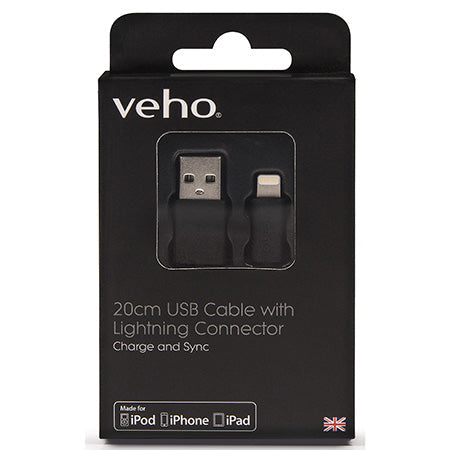 The Veho Pebble™ Apple approved lightning cable is compatible with all Apple lightning configured devices. It is 20cm (200mm, 0.7ft) and comes in black soft touch Tacton rubber with embossed Veho logos.