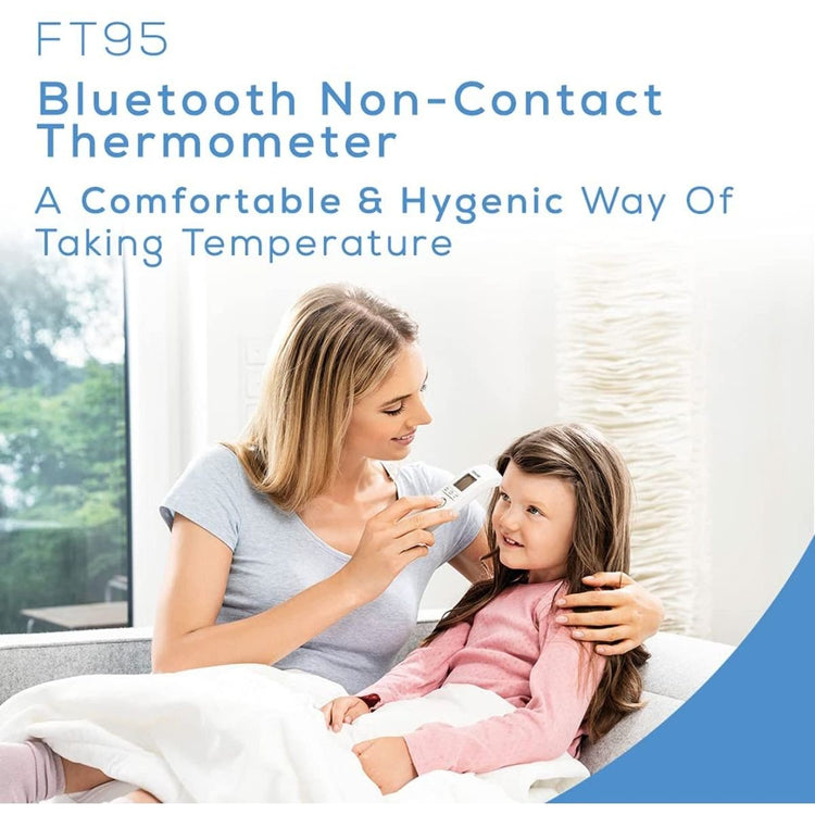 Beurer Bluetooth Non-Contact Thermometer, Forehead, Object, Room Temperature, High Accuracy, XL Blue Illuminated Display, 60 Memory Spaces, White. The FT95 Bluetooth Non-Contact Thermometer is reliable and accurate and provides a hygienic and comfortable method of taking temperature, without needing to wake up your child. Measures at a distance of 0.78-1.18 inches.The versatile thermometer can measure the temperature of a forehead; an object, i.e. a baby's milk bottle; or a room.