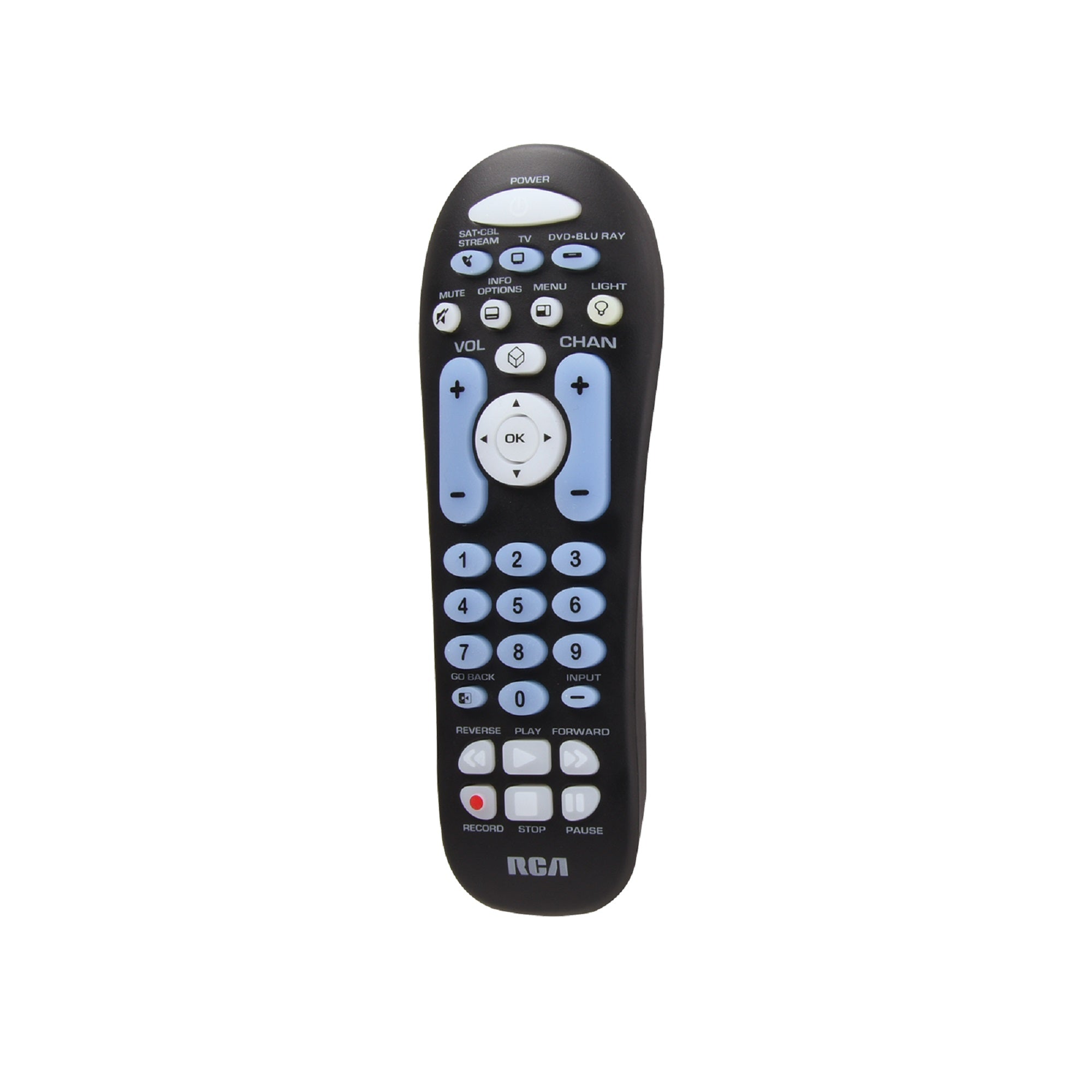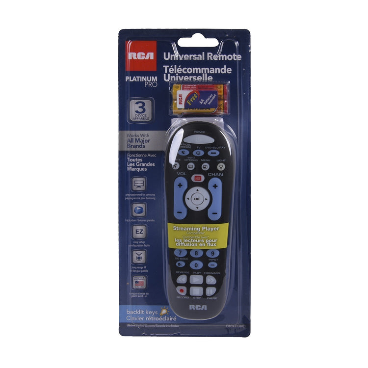 This simple 3 device universal remote makes it easy to take control of your entire home theater. Programming is a breeze, with support for the latest streaming players, like Apple TV and Roku. This remote has large keypads for easy navigation and partial backlighting that allows you to see the keys in the dark. Comes in a black finish.